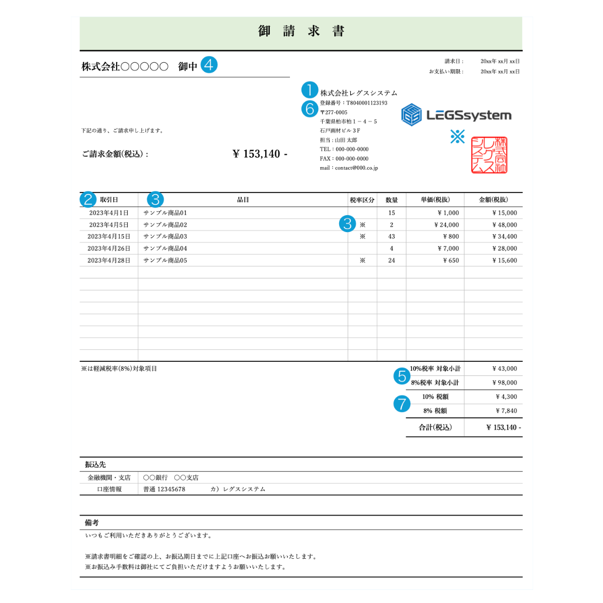 ❺ 税率ごとに区分して合計した対価の金額 税抜または税込及び適用税率
