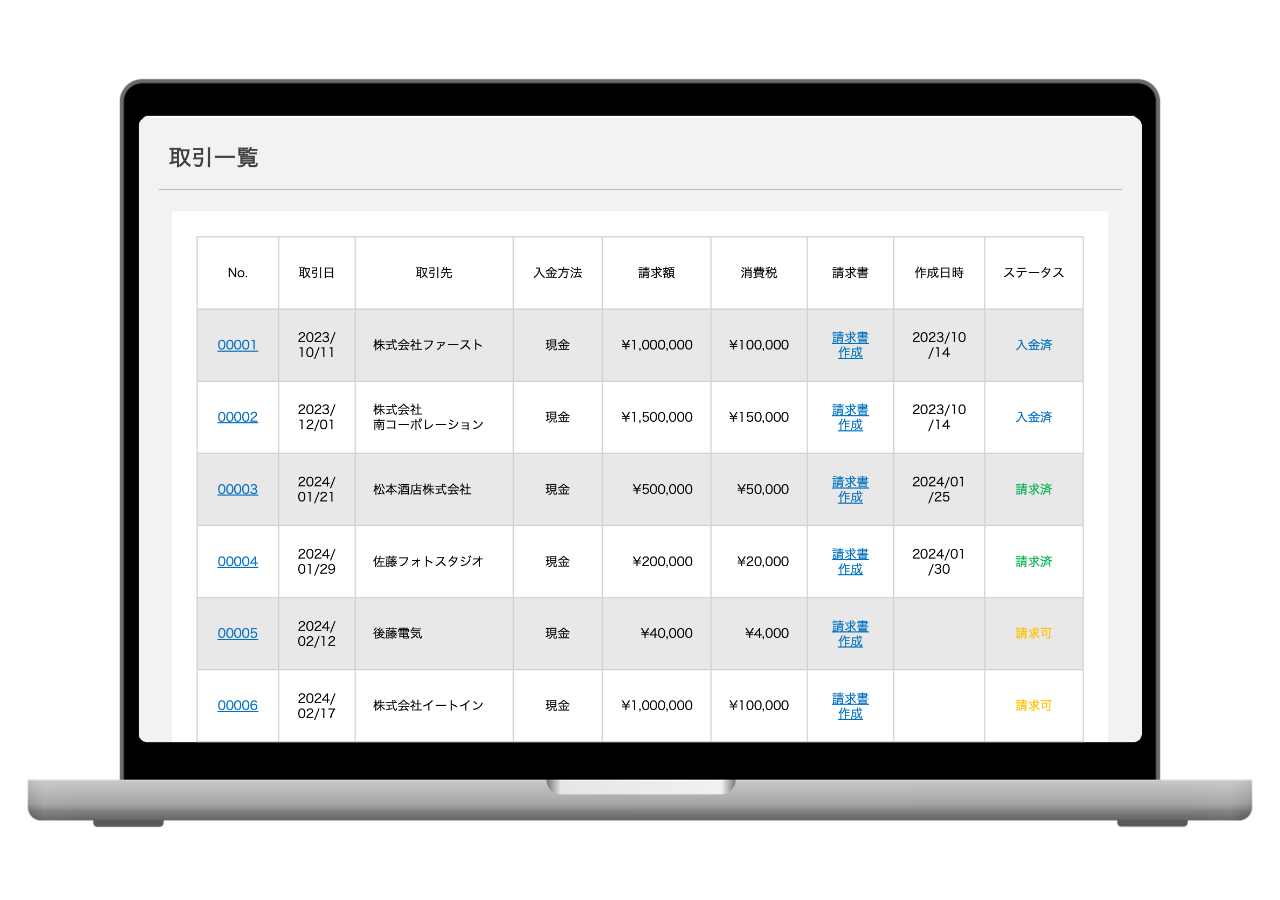 ・取引一覧表のステータス欄で請求や入金 の状況をひと目で確認出来ます